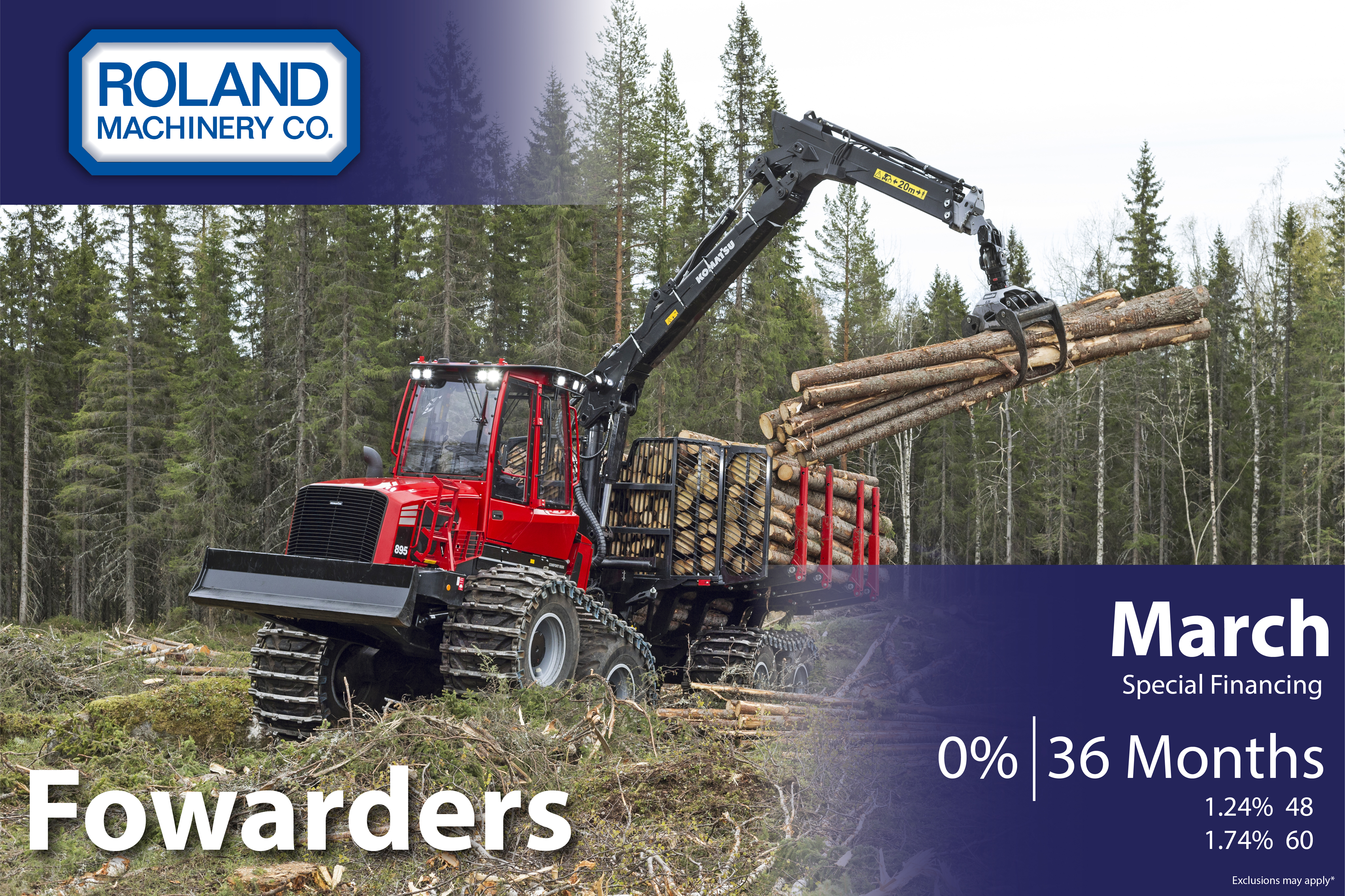 Ashley I / Tuesday, March 10, 2026 / Categories: Deals and Promotions Forwarder Financing March 2026 Forwarders March Special Financing 0% | 36 Months 1.24% 48 1.74% 60 *Exclusions may apply Excavator Financing March 2026 HM300-5 Financing March 2026 Print 20