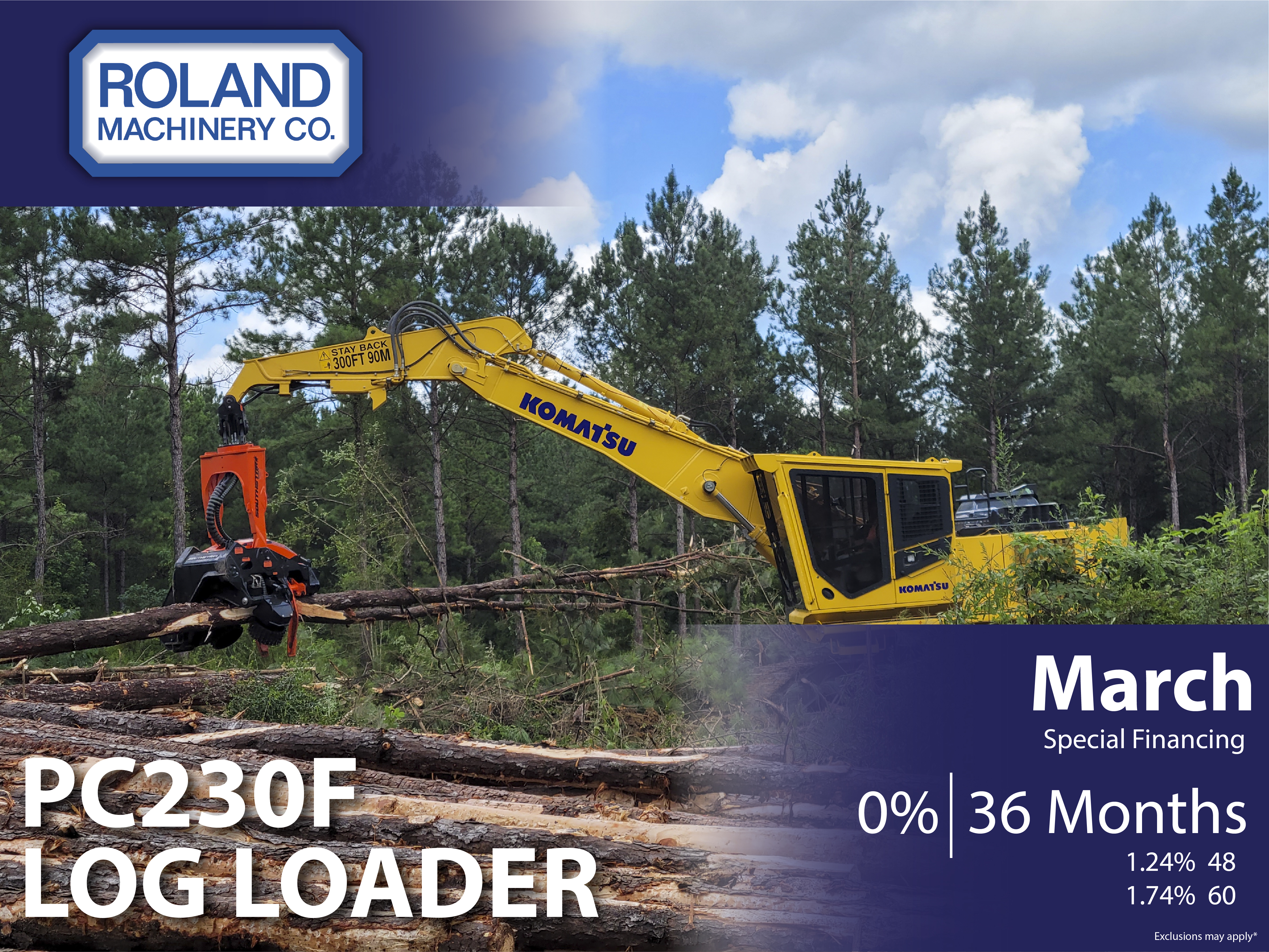 Ashley I / Tuesday, March 10, 2026 / Categories: Deals and Promotions PC230F Log Loader Financing March 2026 PC230F Log Loader March Special Financing 0% | 36 Months 1.24% 48 1.74% 60 *Exclusions may apply PC78 & PC88 Financing March 2026 PC290LL Log Loader Financing March 2026 Print 19